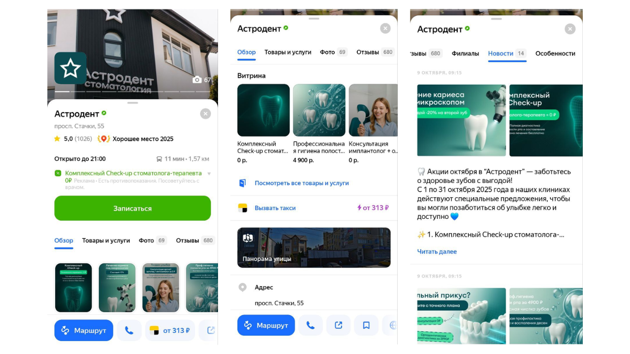 - Максимально заполненный профиль — адрес, график, контакты, сайт, соцсети, витрина с товарами и ценами.